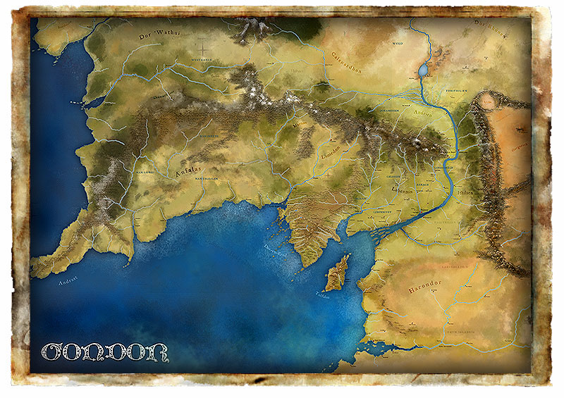 Digitally painted poster map of Gondor in T.A. 1665. Size: A1 (59 × 84 cm). Price: 50 €, international shipping included. Shipped via priority air mail in a cardboard tube.